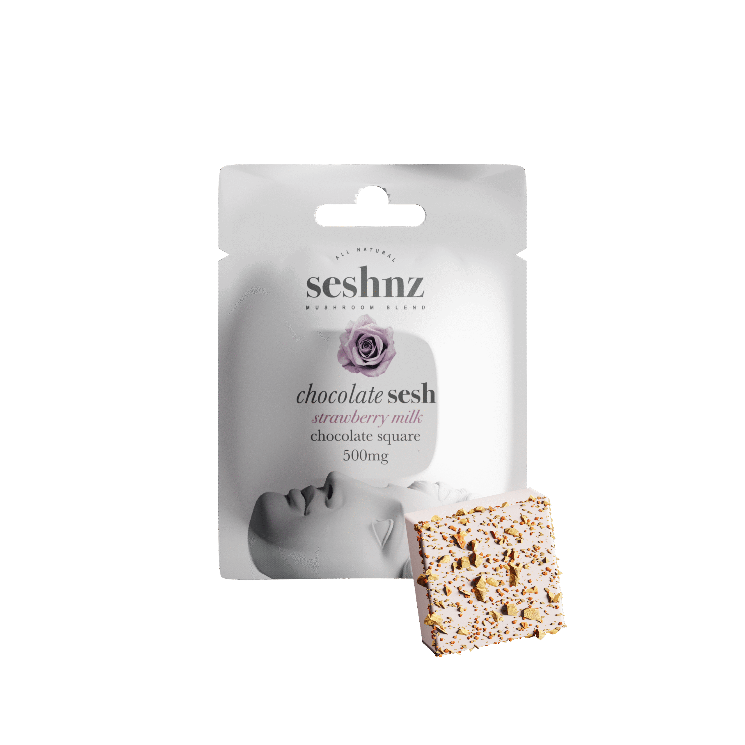 / seshnz chocolate bites | 500 mg | mushroom blend | strawberry milk | singles | pk 25 | $4.25 ea.
